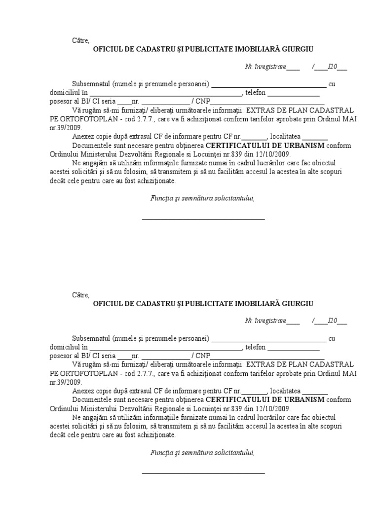 Un ortofotoplan este un document intocmit pe suport aerofotogrammetric, . Acestea sunt intocmite uzual pe suport ortofotoplan. Necessary documentsActe necesare. Emplacement and boundary plan or excerpt from Land Registry on . Solicit comunicarea extrasului din plan cadastral pe ortofotoplan. Cerere extras plan cadastral ortofotoplan.